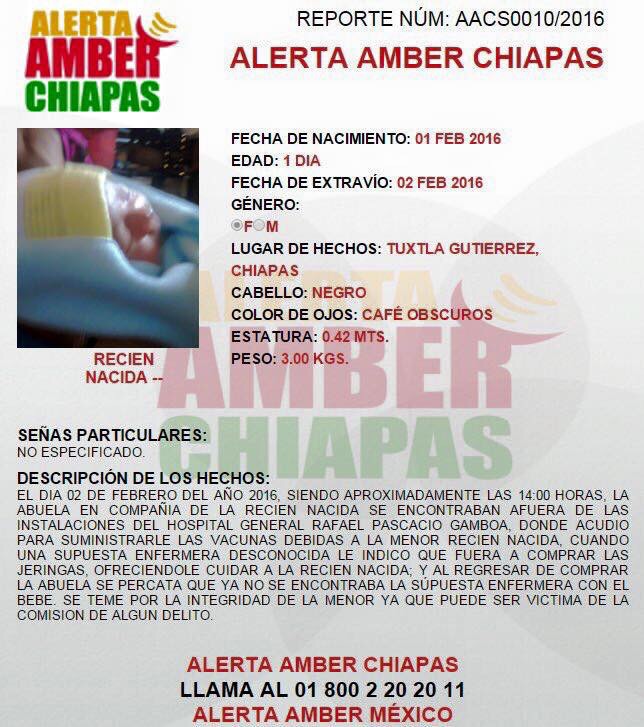 Si usted ha visto a la sospechosa de la desaparición de la recién nacida puede comunicarse al teléfono de Alerta Amber el 01 800 2 20 11